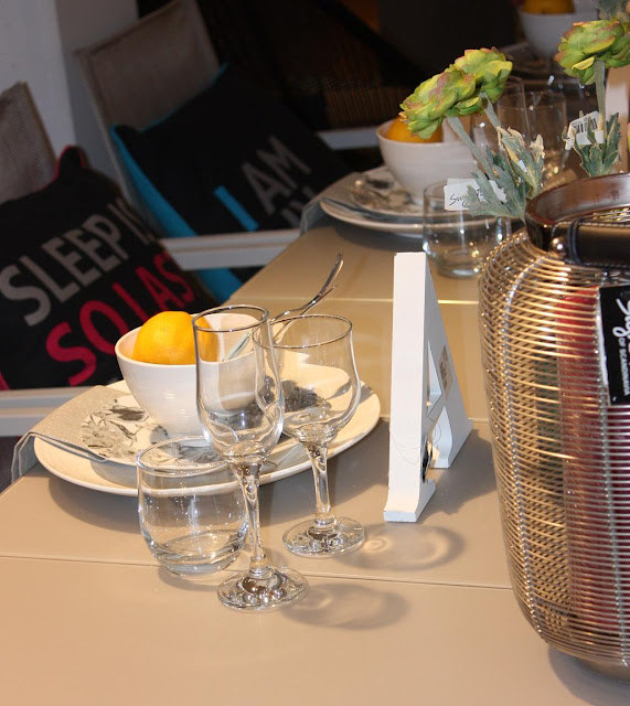 Dette bordet er stylet av Susanne Bjerke med bloggen blanke ark. Legg merke til de artige putene med litt skarpere farger enn det duse.